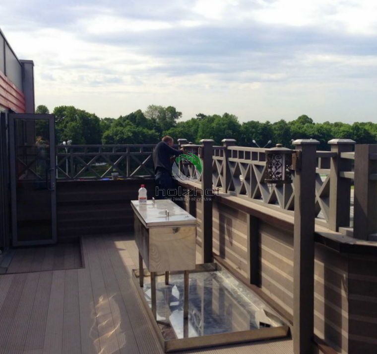 Монтаж был осуществлен бригадой наших монтажников. Все стационарные элементы конструкций, таких как веранда, парапеты, переходы, лестницы столбы и т.п. были обшиты именно террасной доской ДПК Holzhof. Обращаем Ваше внимание, что именно эта доска имеет целый ряд преимуществ для использования ее на коммерческих объектах: